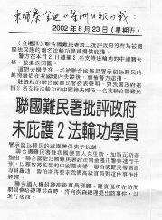 À ce moment là, Mme Zhang et son mari avaient déjà fait déposer des demandes pour obtenir asile auprès du UNHCR (siège social du Haut Commissaire des Nations Unies pour les Réfugiés) et les demandes avaient été acceptées, ils étaient donc des réfugiés protégés par la loi internationale. Étant donné la situation, leur cas a reçu beaucoup d’attention de la part des médias. Le 23 août 2002, le quotidien Xingzhou a rapporté l’événement dans un article intitulé : « Le UNHCR critique le gouvernement pour ne pas avoir protégé deux pratiquants de Falun Gong » (voir illustration).