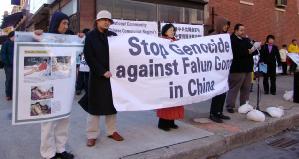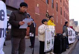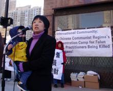 À la conférence de presse, un pratiquant a lu les nouvelles en anglais et en chinois qu'une personne bien informée du PCC avait dévoilé, à savoir que le régime communiste chinois a établi un camp de concentration secret à Sujiatun dans la ville de Shenyang, où au moins 6 000 pratiquants de Falun Gong sont enfermés. Leurs organes vitaux sont récoltés et vendus pour en tirer profit et leurs corps assassinés sont incinérés afin de détruire toutes les preuves. Présentement, les pratiquants emprisonnés au camp de travail de Masanjia et à la prison de Dabei sont transférés à Sujiatun. Les pratiquants des trois provinces du Nord-Est et autres régions y sont également transférés. Un pratiquant porte-parole s’est adressé à voix haute au consulat de l’autre côté de la rue, «Nous espérons que les fonctionnaires du consulat sauront faire la différence entre le bien et le mal selon leur conscience. Si vous le souhaitez, nous pouvons vous rencontrer n’importe quand, n’importe où» La pratiquante Mme Tianxiao Zhang a participé à la conférence avec son jeune enfant et a parlé de la persécution par le PCC de sa soeur Zhang Yunhe et de l’époux de Yunhe, Chu Songtao. Yunhe a été arrêtée et personne ne sait où elle est depuis plus de quatre ans. Songtao a été torturé à mort. Mme Zhang a fait appel au gens pour qu’ils reconnaissent la nature perverse du PCC et se lèvent pour aider à mettre fin à ces crimes. M. Xu, qui a conduit pendant plus d'une heure pour se rendre au consulat a dit, «Je ne peux me calmer longtemps en raison de la persécution misérable qui se passe en Chine. Le week-end passé, lorsque nous avons organisé une manifestation contre les atrocités du PCC à Sujiatun, bien des passants qui connaissaient les faits ont exprimé leur désir de se joindre à nous contre la barbarie du PCC. Face au consulat, j’aimerais dire aux fonctionnaires et au personnel de se retirer du PCC et d’être libres.» À la fin, les pratiquants ont crié ensemble en direction du consulat, «Le Falun Dafa est grand!» « Cessez la persécution contre le Falun Gong » « Veuillez traduire en justice, Jiang Zemin Zhou Yongkang et Liu Jing. » Leurs fortes voix démontraient leur détermination à poursuivre en justice ces voyous.