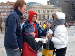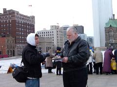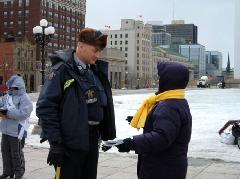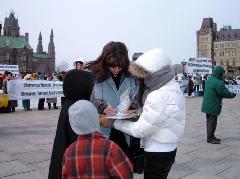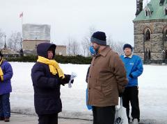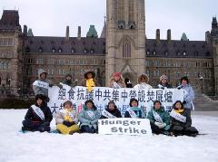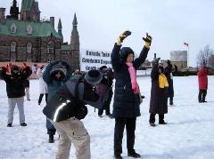 Bravant une température et un vent glacial, quinze pratiquants se sont tranquillement assis dans la neige pour protester le massacre de leurs compagnons pratiquants détenus au camp de concentration de Sujiatun. Leurs actions ont reçu l'appui et le souci de nombreuses personnes au bon cœur, qui ont signé leur pétition. Les médias locaux y compris City TV, The Sun, Ottawa Citizen, Central News Agency et les nouvelles de CTV ont rapporté cet événement.