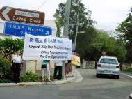 Le 17 mars, un pratiquant a entendu dire qu'il y aurait un dialogue trilatéral le lendemain entre le secrétaire d'État des États-Unis, Rice, le ministre des Affaires étrangères d'Australien, Downer et le ministre des Affaires étrangères du Japon, Taro Aso, sur une base de marine à Sydney. Ils ont immédiatement appliqué pour obtenir un permis de protestation de la police et la demande de permis a été approuvée. Les pratiquants sont arrivés à l'avance à la base isolée pour inspecter et ils ont fait des banderoles durant la nuit.