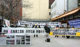 Le 18 mars 2006, comme le nombre de personnes qui ont démissionné du parti communiste chinois (PCC) et de ses organisations affiliées approchent les 9 millions de personnes, les pratiquants de Dafa à Montréal, Canada se sont rassemblés au parc Zhongshan dans le Chinatown pour appuyer les efforts des démissions et en plus dénoncer le prélèvement d’organes des pratiquants de Dafa encore vivants au camp de concentration de Sujiatun.