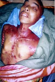 Cela me rappelle le pratiquant de Falun Gong Wang Bin, qui était un ingénieur en informatique à l’Institut d’exploration et de développement du pétrole de Daqing et gagnant du deuxième prix pour le trophée de science nationale. Le 24 septembre 2000, il a été sauvagement battu à mort par l’officier de police Feng Xi du camp de travail de Daqing. Son corps, après que ses organes dont le coeur et le cerveau aient été prélevés, a été placé à la morgue de l’Hôpital du peuple de Daking. La photo ci-contre montre la dépouille de Wang Bin.