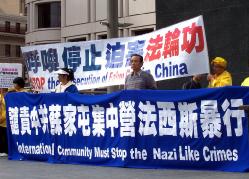 Un pratiquant a fait le premier discours au rassemblement et a présenté la diffusion mondiale du Falun Gong et la persécution du Falun Gong en Chine. Il a dit que Jiang Zemin a lancé la persécution contre le Falun Gong en 1999 avec le mandat de « ruinez leurs réputations, mettez-les en faillite financièrement et détruisez-les physiquement. »