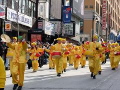 Les pratiquants participaient à ce grand défilé pour la quatrième année consécutive. Un bon nombre de gens étaient familiers avec les mouvements des exercices du Falun Gong et beaucoup imitaient les mouvements. Des pratiquants jouaient du tambour de taille au rythme de la mélodie « Falun Dafa est bon » tandis que la troupe de danse se déployait simultanément.