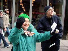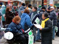 Les pratiquants ont conçus et imprimés des dépliants spécialement pour cet événement et les ont distribués. Pendant qu'un groupe présentait le Falun Gong aux gens, l'autre groupe les offrait des dépliants sur les atrocités horrifiantes ayant lieu à l'intérieur du camp de concentration de Sujiatun. Des milliers de pratiquants ont été détenus au camp où le régime communiste chinois prélève les organes de pratiquants vivants et puis incinère leurs corps.