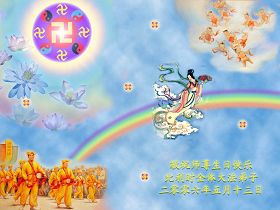 Au nom des pratiquants de mon comté de Pengxi, province de Sichuan et de ma famille, je souhaite par la présente, un heureux anniversaire au Maître et remercie la Maître pour son salut ardu.
