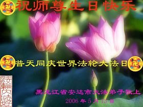 Tous les pratiquants de Falun Dafa de la ville de Mudanjiang, province du Heilongjiang souhaitent respectueusement au vénérable Maître un joyeux anniversaire et célèbrent la septième journée du Falun Dafa du monde!