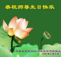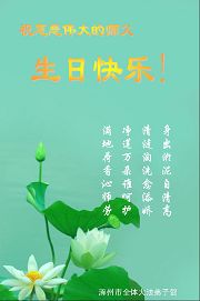 Les pratiquants de Falun Dafa de Binzhou, province du Shandong souhaitent respectueusement au vénérable Maître un joyeux anniversaire!