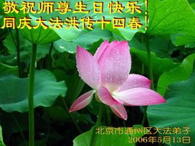 Les pratiquants de Falun Dafa du District de Tongzhou, Beijing, présentent respectueusement leurs vœux de Bon Anniversaire au Maître Vénérable et ils fêtent le Quatorzième Anniversaire de l’introduction de Falun Dafa au publique.