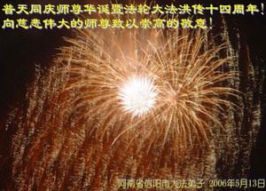 Des pratiquants de Falun Dafa de Xinyang, Province du Henan présentent respectueusement leurs vœux de Bon Anniversaire au Maître Vénérable et ils célèbrent le Quatorzième Anniversaire de l’introduction du Falun Dafa au publique.