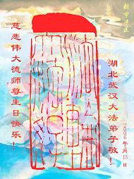Des pratiquants de Falun Dafa de Wuhan, Province du Hubei souhaitent respectueusement un Bon Anniversaire au Maître Vénérable !