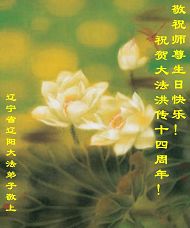 Des pratiquants de Falun Dafa de Liaoyang, Province du Liaoning, souhaitent respectueusement un Bon Anniversaire au Maître Vénérable et ils célèbrent le Quatorzième Anniversaire de la présentation au publique du Falun Dafa !