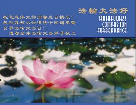 Des pratiquants de Falun Dafa de Dongying et du gisement pétrolier de Shengli, Province du Shandong souhaitent respectueusement un Bon Anniversaire au Maître Vénérable et ils célèbrent le Quatorzième Anniversaire de la présentation du Falun Dafa au publique !