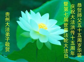 Tous les pratiquants de Falun Dafa dans le Province du Guizhou présentent des voeux respectueux de Bon Anniversaire au Maître vénérable et célèbrent le 14e Anniversaire de l’introduction du Falun Dafa au public ainsi que la Journée Mondiale du Falun Dafa!