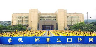 Encore une année passée à aider Maître dans la rectification de la loi. 13 mai – journée de Falun Dafa – le glorieux événement que célèbrent ensemble le ciel et la terre. Plus de 2’000 pratiquants de Falun Gong du Nord de Taïwan se sont rassemblés sur la Place de l’hôtel de ville de Taïpeh pour faire la démonstration des exercices et célébrer la 14ème année depuis que Maître a commencé à enseigner la Loi et les 55 ans de Maître.