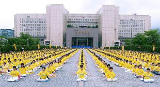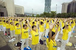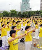 Le matin du 13 mai, la place de l’hôtel de ville de Taïpeh était remplie de joie. Les pratiquants de Falun Gong habillés en jaune sont venus de différents endroits. Bientôt la place était couverte de monde. Ils ont pratiqué les exercices en musique. Le groupe, bien disposé et paisible, et leurs mouvements lents et gracieux ont attiré l’attention des passants.