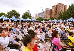 Le drapeau de la télévision NTDTV et la troupe des tambours ont ouvert le spectacle. Le public a répondu par une salve d’applaudissements en voyant leurs drapeaux volants et écoutant leurs rythmes puissants. Les jolies chansons « Ouvre la fenêtre » et « Vent d’espoir » par la chorale de NTDTV ont également ravi le public. Le numéro des jeunes pratiquants de l’école Minghui était très mignon, l’assistance a beaucoup aimé. La pianiste Xie Xiaoqing a joué sa propre composition -- Nu Wa (déesse des contes chinois). La soprano, Huang Jiayi a chanté « l’Ame noble dans le vent » condamnant le trafic d’organes par le Parti communiste chinois et louant le courage et la noblesse des pratiquants de Falun Gong. Le chanteur populaire Huang Dacheng, a entraîné le public de sa voix envoûtante et conquis le public par son humour.