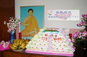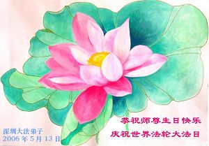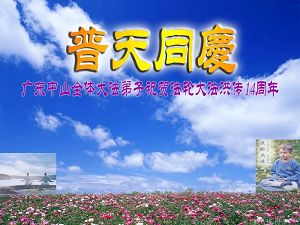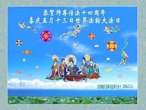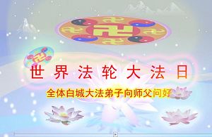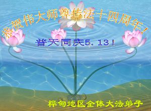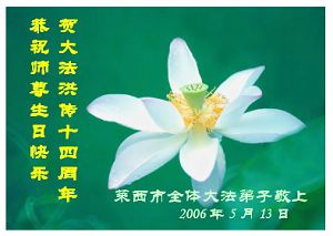 Tous les pratiquants de Falun Dafa qui sont sans abri pour éviter la persécution à Weifang souhaitent respectueusement au vénérable Maître un bon anniversaire et célèbrent le quatorzième anniversaire de la présentation du Falun Dafa au public!