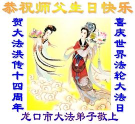 Les pratiquants de Falun Dafa de la ville de Longkou souhaitent respectueusement au vénérable Maître un bon anniversaire !