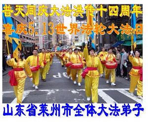 Les pratiquants de Falun Dafa de la ville de Laixi, de la province du Shandong souhaitent respectueusement au vénérable maître un bon anniversaire et célèbrent le quatorzième anniversaire de la présentation du Falun Dafa au public !