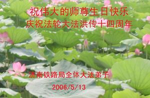 Les pratiquants de Falun Dafa du bureau ferroviaire de Jinan souhaitent respectueusement au vénérable Maître un bon anniversaire!