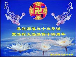 Tous les pratiquants de Falun Dafa à Tangshan, province du Hebei, souhaitent au Maître un joyeux anniversaire et fêtent le quatorzième anniversaire de l'introduction publique de Falun Dafa.