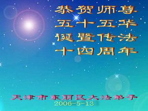 Les pratiquants de Tianjin souhaitent avec respect un joyeux anniversaire au Maître vénéré ! Et célébrent le 14ème anniversaire de l'introduction publique du Falun Dafa !
