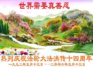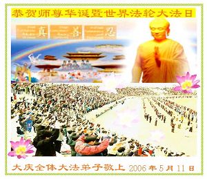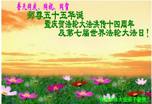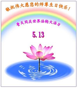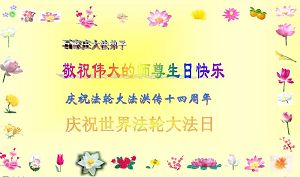 Les pratiquants qui sont sans abri pour éviter la persécution, transmettent leurs vœux avec respect pour l'anniversaire du Maître vénéré ! Célébrer le 14ème anniversaire de l'introduction publique de Falun Dafa et de la journée mondiale du Falun Dafa!