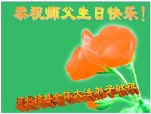 Tous les pratiquants de Falun Dafa du comté de Zhao, Ningjin, Jinzhou, Xiji, de la province du Hebei souhaitent avec respect un cinquante-cinquième anniversaire heureux au Maître vénéré ! Maître, vous avez travaillé dur!