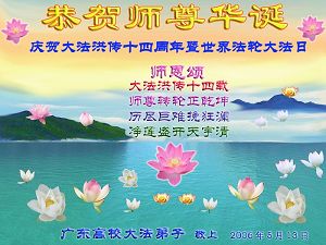 Les pratiquants du système éducatif de Guangzhou, province du Guangdong souhaitent respectueusement à Maître un bon anniversaire! Et félicitons le 7e anniversaire de la « Journée mondiale du Falun Dafa! »