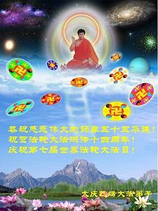 Et célébrons le 14e anniversaire de la présentation publique du Falun Dafa. Félicitons tous les pratiquants du monde en ce 7e anniversaire de la « Journée mondiale du Falun Dafa! »Travaillons plus diligemment en faisant bien les trois choses et sauvons les gens.