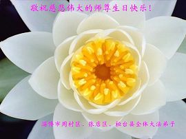 Les pratiquants de Falun Dafa de Zhoucun, Zhangdian et Huantai souhaitent respectueusement au vénérable Maître un joyeux anniversaire!