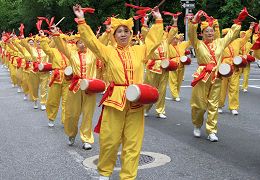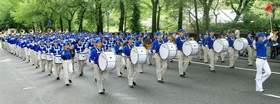 Le groupe d’exercices du Falun Gong derrière la fanfare a présenté les lents et gracieux exercices du Falun Gong. Les vigoureux tambours à la ceinture dans leurs brillants costumes dorés, avec les ceintures rouges des tambours ont attiré l’attention de nombreuses personnes tout le long de la Cinquième avenue.