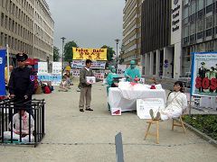Quelques pratiquants ont fait une démonstration des exercices. Toute l’activité fut pacifique et ordonnée. Plusieurs participants à la réunion de l’UE et des passants ont arrêté à l’activité pour entendre et apprendre la vérité sur le Falun Gong et la persécution. Une dame, ne pouvait pas croire ce qu’elle lisait et entendait, et a demandé aux pratiquants : « Ceci n’est qu’un spectacle, ce n’est pas réel, n’est-ce-pas? » Quand les pratiquants lui ont dit que tout ce qui est reconstitué est bien réel en Chine, et cela depuis au moins sept ans, elle a été émue et a dit que les crimes doivent arrêter. Quelques passants ont demandé aux pratiquants quand aurait lieu la prochaine activité.