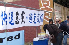 Le 17 juin 2006, les pratiquants de Falun Gong ont de nouveau organisé un rassemblement à Chinatown pour soutenir les dix millions de démissions du Parti communiste chinois (PCC) et pour demander à tous les milieux de prêter attention et arrêter la persécution du PCC contre le Falun Gong. Sur le lieu de rendez-vous, il y avait des banderoles en anglais et en chinois, et des affiches exposant les crimes du PCC.