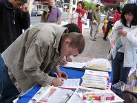 Une occidentale a pris des photos des banderoles et des affiches. Vu les sacs lourds sur son dos, on pouvait dire qu'elle venait de loin. Elle a dit à un pratiquant qu'elle venait d'Angleterre et qu’elle avait visité beaucoup d'endroits. À Melbourne, elle a vu des activités semblables organisées par des pratiquants de Falun Gong et elle a appris quelques faits sur la persécution contre le Falun Gong en Chine. Elle a dit, « Dans ce monde d'aujourd'hui, comment est-ce qu’un régime plus brutal que les Nazis fascistes peut exister?! Devant une telle persécution inhumaine et barbare, tout le monde ne devrait pas se taire, mais se lever pour l'arrêter. J'ai signé la pétition à Melbourne. Je parlerai à mes amis de la persécution et je ferai en sorte que toutes les personnes condamnent les atrocités du PCC. »