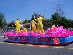 Le char des pratiquants avait un aspect rafraîchissant, avec ses grandes fleurs de lotus. Les pratiquants dans leurs costumes d’exercices ont fait une démonstration des exercices debout sur le char pendant que d’autres méditaient, assis à l’intérieur des fleurs, donnant au monde une vue de paix et de beauté dans ce bruyant défilé. En plus des pratiquants, le groupe des Fées Célestes et la troupe des tambours à la ceinture ont joué la musique de « Falun Dafa est bon ». La performance a été très bien reçue. De nombreux spectateurs ont salué et reconnu les pratiquants. Parmi la foule, il y avait aussi de nombreux Chinois qui ont salué et montré leur appui aux pratiquants.