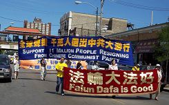 La parade a transmis d’autres messages aux spectateurs : « Falun Dafa est bon », « Le monde a besoin de Vérité-Compassion-Tolérance », « Amener Jiang Luo, Liu et Zhou devant la justice , arrêtez de persécuter le Falun Gong », « Ouvrir une enquête sur les crimes de prélèvement des organes des pratiquants encore vivants dans les camps de travaux forcés ». La dernière partie de la procession « Appui mondial aux onze millions de Chinois qui ont démissionné du PCC et de ses organisations affiliées » a été particulièrement important pour les spectateurs du Chinatown.