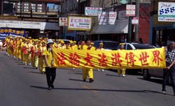 Pendant que le défilé passait, les gens sont sortis de leur boutique, des restaurants, banques et bureaux de poste. Ce qu’ils ont vu était des pratiquants du Falun Gong affichant un comportement et un esprit noble et inébranlable après avoir passé à travers sept ans de persécution brutale.