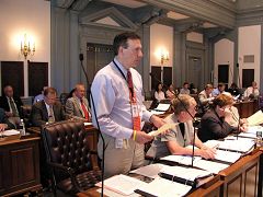 Avant la session, les pratiquants de Falun Gong ont rendu visite à l’ancien maire Hal Godwin de Newark, qui travaille maintenant dans un comté méridional du Delaware. Lorsqu’il était maire de Newark, il avait présenté une proclamation pour le Falun Gong. En raison de la grande pression de l'ambassade chinoise, il avait retiré la proclamation. A ce moment-là, les pratiquants lui avaient clarifié la vérité de nombreuses fois, mais sans résultat. Plus tard, il a perdu l'élection de maire et a déménagé ailleurs. Cette fois, les pratiquants lui ont parlé de nouveau du Falun Gong et de la persécution brutale en Chine, et son attitude était complètement différente d'avant. Il a dit qu’alors, lui-même et le gouvernement de l'état avait reçu une pression énorme du PCC. Il était plein de regrets à ce sujet. Il a dit en se moquant de lui-même, « Le PCC m'a exilé dans le sud. »