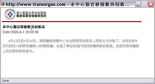 De plus, le journal Liberation Daily a rapporté le 27 octobre 2004 que tout le pays avait réalisé plus de 6000 greffes de reins et plus de 2000 greffes de foie.