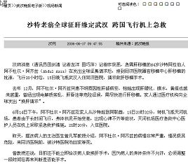 « Les nouvelles de Hanwang (correspondant Tian Jianqing, journalistes Zuo Yang et Tian Qiaoping). Les journalistes ont appris hier qu’après avoir commencé une recherche à travers le monde [pour un donateur de foie], Abdul Aziz âgé de 64 ans de l’Arabie Saoudite, avait besoin de se faire greffer un foie de façon urgente, il a reçu l’autorisation d’obtenir une transplantation du foie au centre de transplantation de l’hôpital Tongji. Il est arrivé dans la ville de Wuhan dans la soirée du 15 juin après un vol de 28 heures et s’est rendu à l’hôpital de Tongji pour une opération de transplantation du foie.