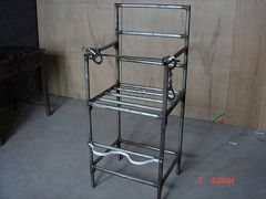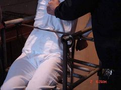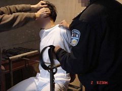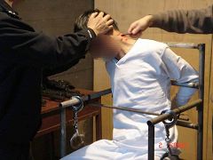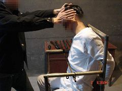Lei Ming a été emmené au poste de police de la rue de Qingming le 5 mars 2002. En moins d’une heure un grand nombre d’officiers de police du département de police de la ville de Changchun se sont rendus au poste de la rue de Qingming. Ils ont mis Lei Ming dans une voiture et l’ont emmené au département de police de la ville de Changchun, au sixième étage dans une pièce et l’ont attaché à une chaise de fer. La chaise en métal est bien plus grande qu’une chaise normale ; une personne a besoin d’être aidée pour s’y installer. Après être assis sur la chaise, les pieds de Lei Ming ne touchaient plus le sol et ils ont été fixés sur les pieds de l’instrument de torture. Une barre en métal a été insérée entre des deux trous sur les accoudoirs de la chaise et pressé fortement contre l’abdomen de Lei Ming. Les officiers de police ont fixé la barre en métal et menotté les mains de Lei Ming derrière la chaise. Un officier de police a soudainement électrocuté le dos de Lei Ming avec une matraque électrique dotée d’un bout coupant [les photos qui suivent sont des mises en scènes de la torture que subissent les pratiquants de Falun Gong.]