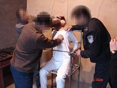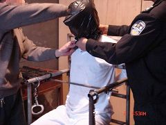 la chaise et des officiers de police tiraient violemment la ceinture.