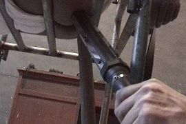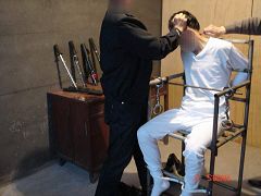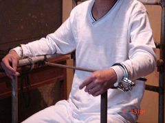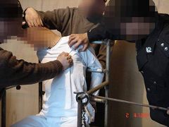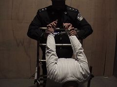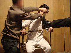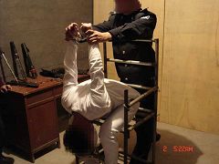 Après environ une demi-heure, les voitures se sont arrêtées et la police lui a retiré le bandeau. Il a estimé qu’il était environ 22 heures. Il faisait nuit et il ne distinguait qu’à peine la silhouette d’un bâtiment. La police a traîné Lei Ming, hors de la voiture dans une pièce où se trouvaient une chaise en métal, des matraques électriques, des sacs en plastique, une grande bassine en métal et des fers à repasser. Au vu de la décoration de la pièce il devait s’agir d’un vieil hôtel déserté qui n’avait pas de système de chauffage. La police a porté Lei Ming sur la chaise en fer. Ils ont attaché ses pieds avec des cordes fines et ont une fois de plus inséré la barre en métal à travers les trous des accoudoirs de la chaise en fer et l’ont fixée à cet endroit. Puis ils ont tiré ses bras en arrière par-dessus le haut du dos de la chaise et ont menotté ses mains. La police a ensuite relié les menottes à la colonne du bas de la chaise avec une ceinture en cuir afin que les bras de Lei Ming soient étirés à l’extrême. Deux officiers de police ont violemment tiré d’un coup sec vers le bas la ceinture et ont essayé de la fermer au trou le plus étroit. Lei Ming a senti une douleur très forte alors que les menottes pénétraient contre les os de ses poignets et que ces mains étaient étirées à l’extrême en arrière. Lei Ming s’est battu de toutes ses forces. La police n’est pas parvenue à fermer la ceinture. Un des officiers de police exaspéré a cogné violemment les menottes et est finalement parvenu à la fermer au plus serré. Lei Ming est presque devenu inconscient à cause de la douleur et transpirait abondement. Il ne pouvait pas décrire ce qu’il ressentait à ce moment avec des mots. Il ne pouvait pas du tout bouger.