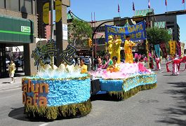 Le matin du 8 juillet, plus de cent pratiquants de Falun Gong ont organisé un défilé dans le Chinatown de Calgary, un centre d’industrie pétrolière du Canada. Les roulements de tambour vigoureux et rythmiques des tambours à la ceinture, le char avec de splendides couleurs et à la ligne élégante et les magnifiques et élégantes danse des rubans et de l’éventail, la présentation des exercices et la musique de « Falun Dafa est bon » ont présenté le merveilleux Falun Dafa. En même temps, des pratiquants portaient des banderoles et des affiches sur la persécution brutale du Falun Gong en Chine et ils ont présenté la reconstitution du prélèvement des organes et une banderole sur laquelle on pouvait lire « Prélèvement des organes vivants est inacceptable et intolérable selon les principes du ciel. L’enquête indépendante canadienne confirme que le PCC prélève des organes vivants. »