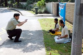 Selon Chen Peiyu, deux policiers au commissariat lui ont demandé : « Qui a amené la banderole ici (à l'ambassade chinoise)? » « Qui vous a dit de venir? » et « Pourquoi êtes-vous là? » Les policiers ont à plusieurs reprises déclaré que le contenu de la banderole insultait l'ambassade chinoise, harcelait les passants et violait la loi à Singapour. Chen Peiyu les a interrogés : « Nous venons à l'ambassade chinoise pour faire les exercices presqu’à chaque jour depuis plus d'un an et nous avons également suspendus des banderoles pendant un certain temps déjà. La police vient à l'ambassade chinoise presqu’à chaque jour. Beaucoup de policiers ont dit que nous n'avons pas violé la loi. Pourquoi me dites-vous que j’ai violé la loi aujourd'hui? » Les deux policiers n'ont pas répondu. Chen Peiyu a ajouté : « Les pratiquants du Falun Gong dans de nombreux pays à travers le monde protestent devant l'ambassade chinoise. Pourquoi n'est-ce pas permis à Singapour? » Deux policiers ont dit que Singapour est différent des autres pays. Les deux policiers ont seulement répété que les pratiquants ont violé la loi en suspendant une banderole devant l'ambassade chinoise.
