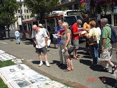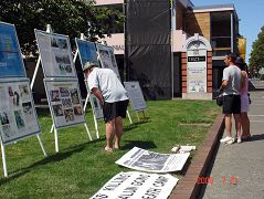 A midi, le 21 juillet 2006, les pratiquants du Falun Gong, à Victoria, BC, Canada se sont rassemblés sur la pelouse en face de l’Hôtel de ville pour dénoncer la persécution. Ils ont étalé des photos des Neuf Commentaire du Parti Communiste, ils ont révélé les méthodes de torture utilisées par le PCC pour persécuter les pratiquants du Falun Gong et les atrocités du prélèvement des organes sur des personnes vivantes. Ils veulent aider plus de gens à comprendre et à voir clairement la nature perverse du PCC et demandent aux gens de se joindre à leurs efforts pour arrêter les atrocités du PCC.