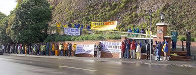 Le matin du 21 juillet 2006, il pleuvait et il grêlait à Wellington, la capitale de la Nouvelle-Zélande, Des pratiquants du Falun Gong du pays entier se sont rassemblés en face de l’ambassade de Chine pour dénoncer la persécution.