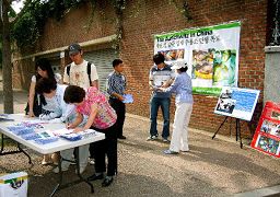 Les pratiquants ont aussi installé une exposition photos de Clarification de la vérité sur la route menant à l’Université et ont affiché du matériel sur les camps de concentration et les camps de travaux forcés chinois à l’extérieur de l’entrée de l’université. À l’intérieur de la salle d’exposition, il y avait une pétition pour sauver le pratiquant monsieur Kim qui a été injustement condamné à la prison par le régime communiste chinois.